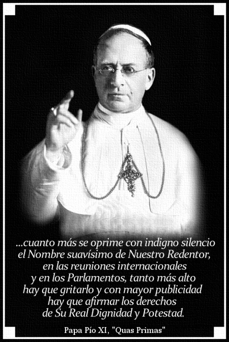 A los demás, para el condenar y reparar en alguna manera, esta apostasía, producida, con tanto daño de la sociedad, por el laicismo, ¿no parece que hay que ayudar a la celebración anual de la Fiesta de Cristo Rey entre todas las gentes? En verdad: cuanto más con un indigno silencio, el nombre de nuestro Redentor, en las reuniones internacionales y en los parlamentos, tanto más allá como en la publicidad, se afirma que los derechos de Su Real Dignidad y Potestad.