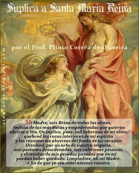 Hagamos, entonces, a Nuestra Señora este pedido: "Mi Madre, sois Reina de todas las almas, incluso de las más duras y empedernidas que quieran abrirse a Vos. Os suplico, pues: sed Soberana de mi alma; quebrad las rocas interiores de mi espíritu y las resistencias abyectas del fondo de mi corazón. Disolved, por un acto de vuestro imperio, mis pasiones desordenadas, mis voliciones pésimas, y el residuo de mis pecados pasados que en mí puedan haber quedado. Limpiadme, oh mi Madre, a fin de que yo sea enteramente vuestro".