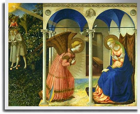 En el jardín de las delicias hay una virgen que se encuentra en presencia de un ángel y un coloquio se establece entre ellos. En Nazaret una virgen es igualmente interpelada por un ángel y se entabla entre ellos un diálogo; mas el ángel del paraíso terrenal es un ángel de las tinieblas y el de Nazaret un espíritu celestial. En los dos encuentros es el ángel el que toma la palabra. "¿Por qué, dice el espíritu maldito a la primera mujer, Dios os ha mandado no comáis de todos los árboles de este jardín?" En esta pregunta repentina se siente ya la provocación al mal, el desprecio, el odio contra la débil criatura en la cual Satanás va persiguiendo a Dios.