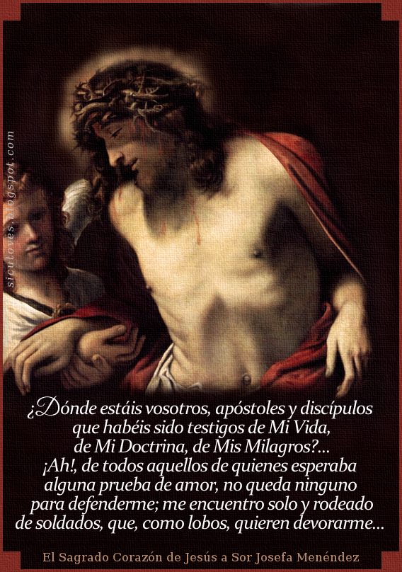 ¿Dónde estáis vosotros, apóstoles y discípulos que habéis sido testigos de Mi Vida, de Mi Doctrina, de Mis Milagros?... ¡Ah!, de todos aquellos de quienes esperaba alguna prueba de amor, no queda ninguno para defenderme; me encuentro solo y rodeado de soldados, que, como lobos, quieren devorarme.