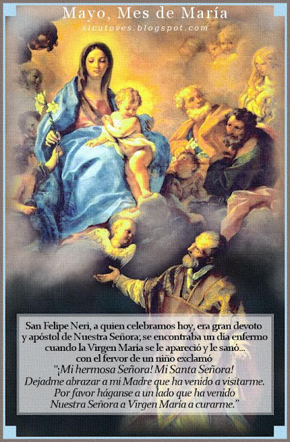 "San Felipe Neri, a quien celebramos hoy, era gran devoto y apóstol de Nuestra Señora; se encontraba un día enfermo cuando la Virgen María se le apareció y le sanó... con el fervor de un niño, el Santo exclamó “¡Mi hermosa Señora! Mi Santa Señora! Dejadme abrazar a mi Madre que ha venido a visitarme. Por favor háganse a un lado que ha venido Nuestra Señora la Virgen María a curarme.”...."