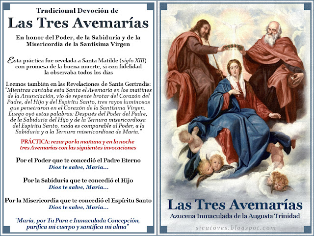 Bendita sea Tu pureza y eternamente lo sea, pues todo un Dios se recrea, en tan graciosa belleza. A Ti, celestial Princesa, Virgen Sagrada María, yo te ofrezco en este día, alma vida y corazón. Mírame con compasión, no me dejes, Madre mía, por Tu Pura Concepción, ni de noche ni de día hasta morir en Tu amor. Amén.