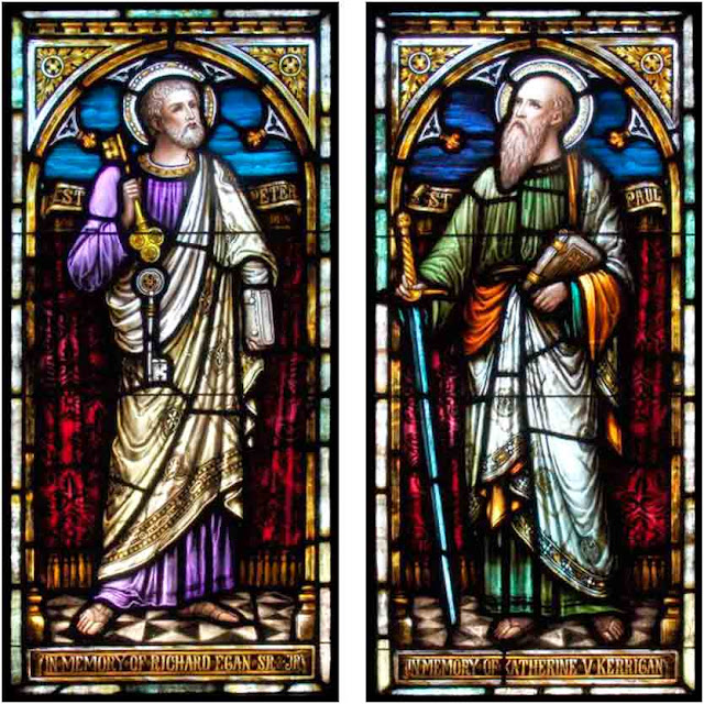 - En Roma, el triunfo de los santos Apóstoles Pedro y Pablo, los cuales, en un mismo año y día padecieron, de orden del Emperador Nerón: el primero fue crucificado cabeza abajo en la misma Ciudad y enterrado en el Vaticano junto a la vía Triunfal, donde es visitado con veneración de todo el Orbe. San Pablo fue decapitado y sepultado en la vía Ostiense, donde es venerado con igual culto.