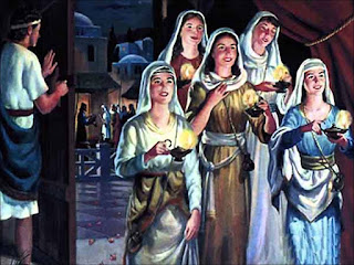 En aquel tiempo, Jesús dijo a sus discípulos esta parábola: "El Reino de los cielos es semejante a diez jóvenes, que tomando sus lámparas, salieron al encuentro del esposo. Cinco de ellas eran descuidadas y cinco, previsoras. Las descuidadas llevaron sus lámparas, pero no llevaron aceite para llenarlas de nuevo; las previsoras, en cambio, llevaron cada una un frasco de aceite junto con su lámpara. Como el esposo tardaba, les entró sueño a todas y se durmieron.